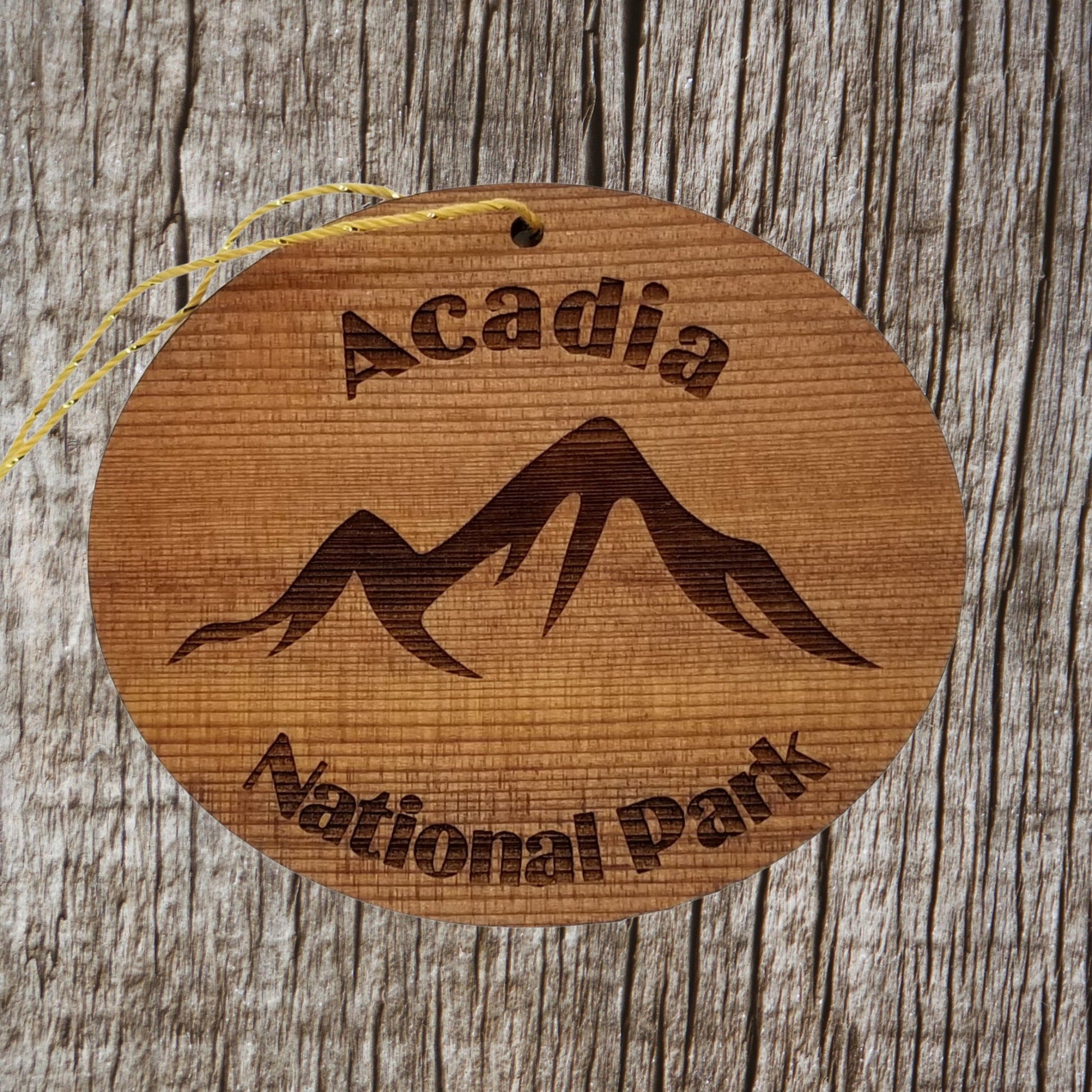 Acadia National Park Maine Souvenir Ornament with Mountains and engraved with a Acadia National Park namedrop. These wood laser cut handmade ornaments are made in our little father and daughter woodshop in northern California.