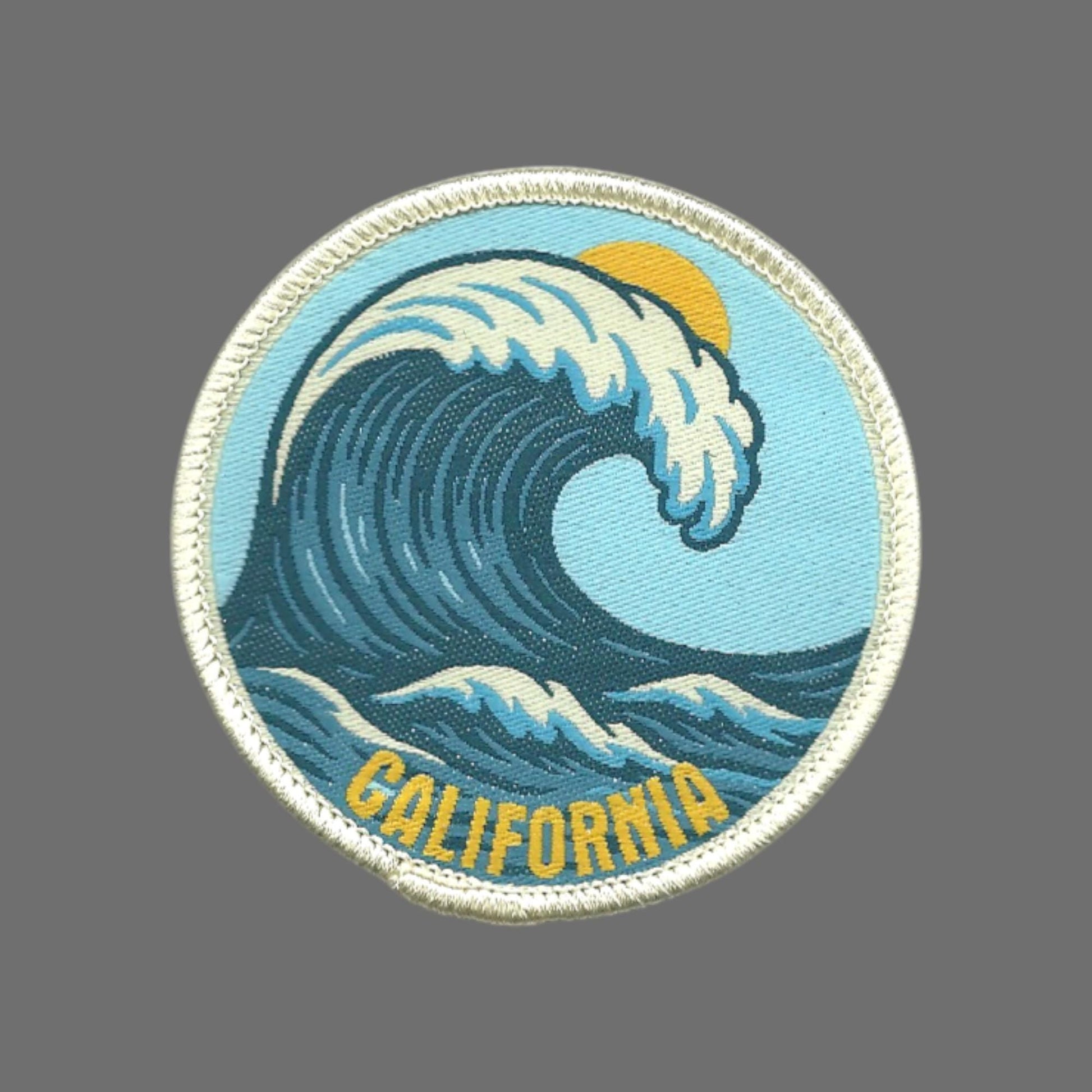 California Big Wave with small waves and sun WOVEN Patch, Badge, or Emblem. Text says California