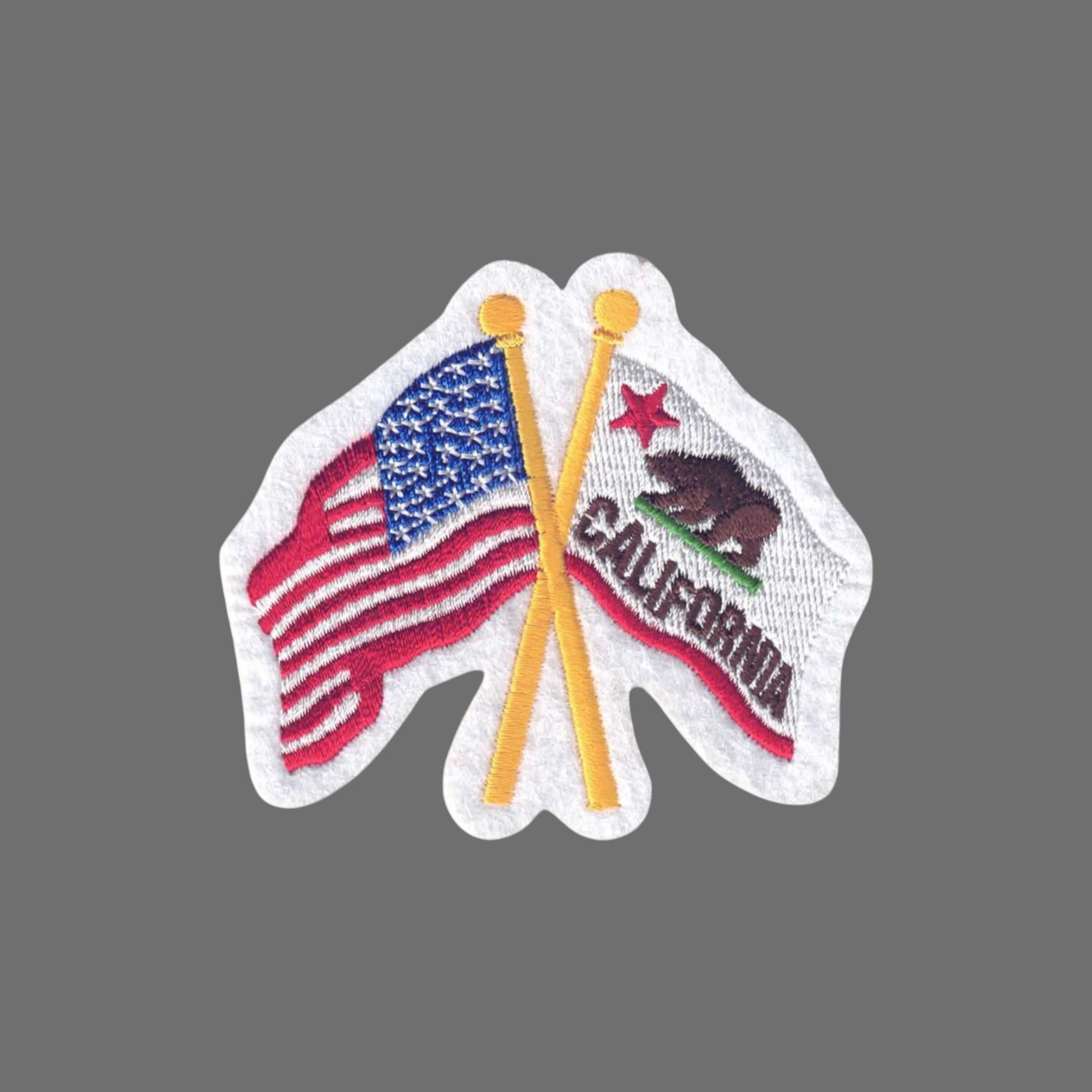 1215 - California and USA Flags Crossed on White Felt Embroidered Iron On Souvenir Patch