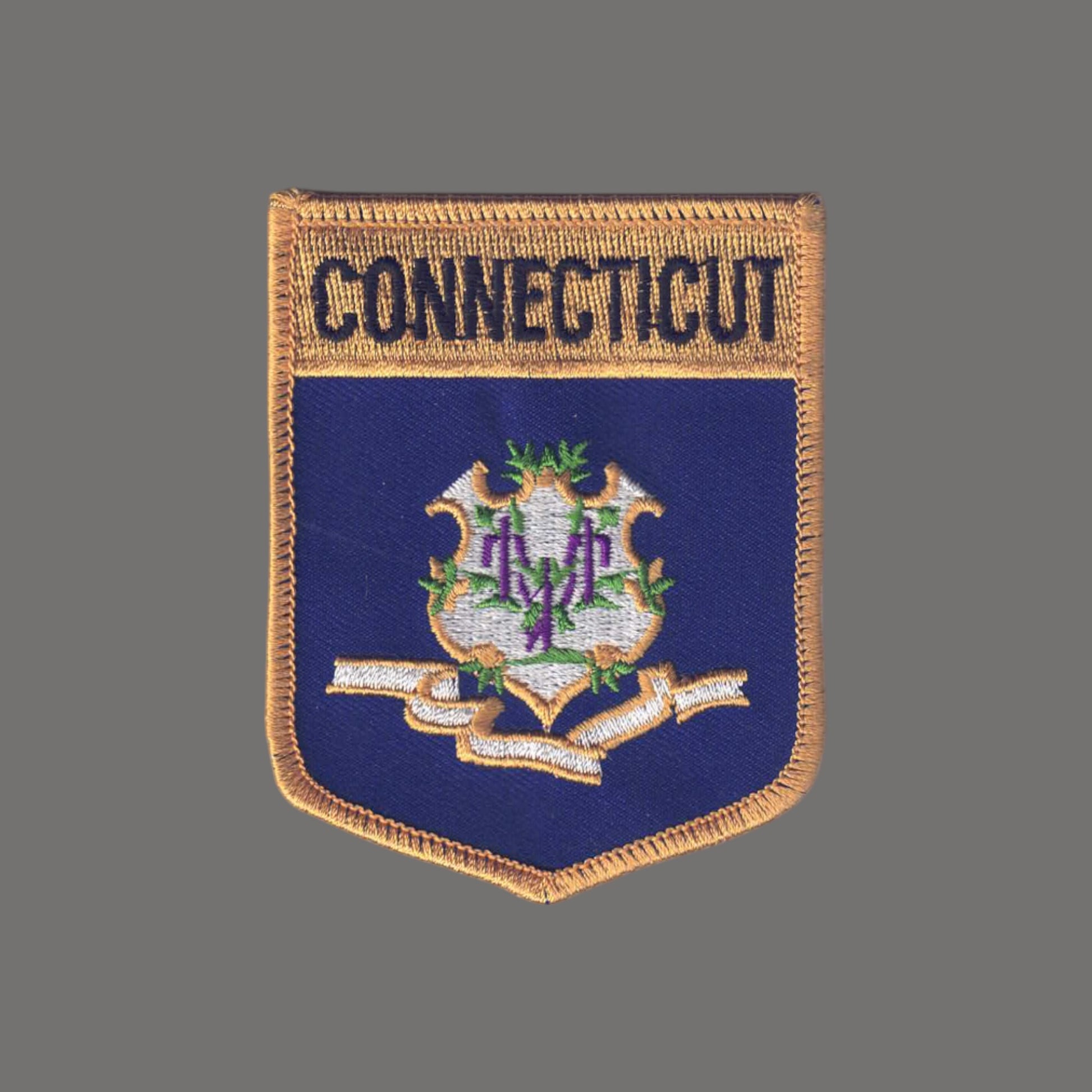 1302 - CONNECTICUT Large Flag Shield Embroidered Iron On Uniform or Souvenir Patch, Badge, or Emblem.