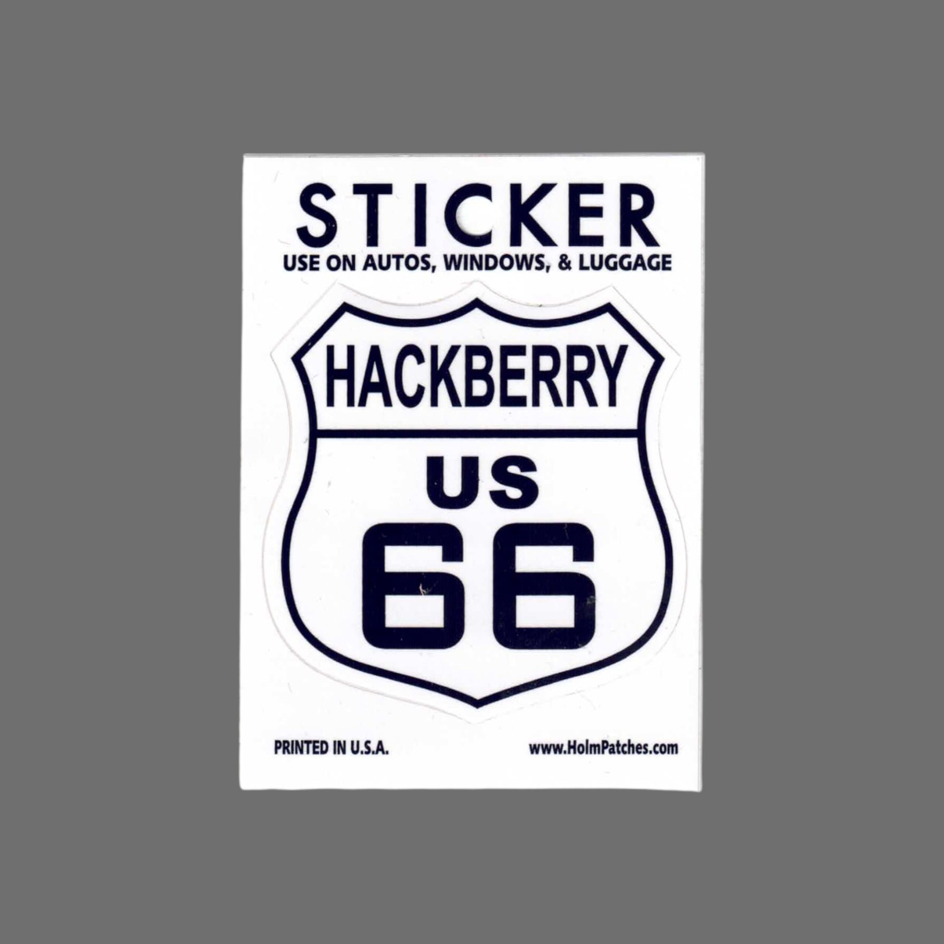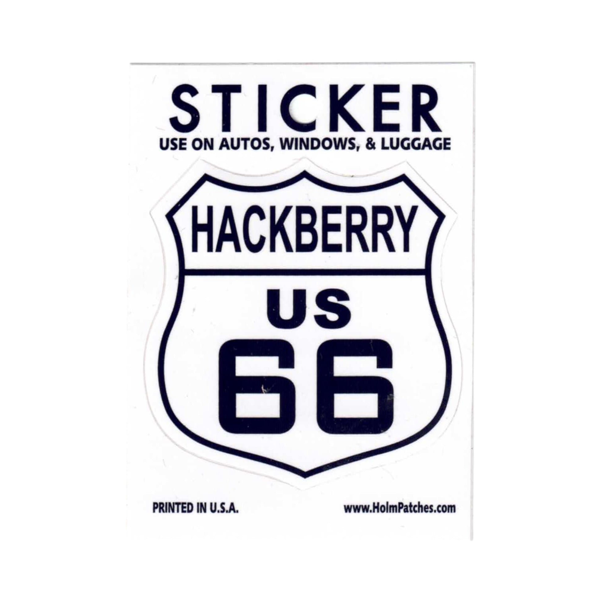 0450-66HACKBERRY - HACKBERRY US 66 sticker. Shield peels off to shape & measures 2.625" wide x 2.75" tall. Printed to be fade resistant in the sun. Suitable for a bumper, outside of a window, or luggage. © Holm Patches