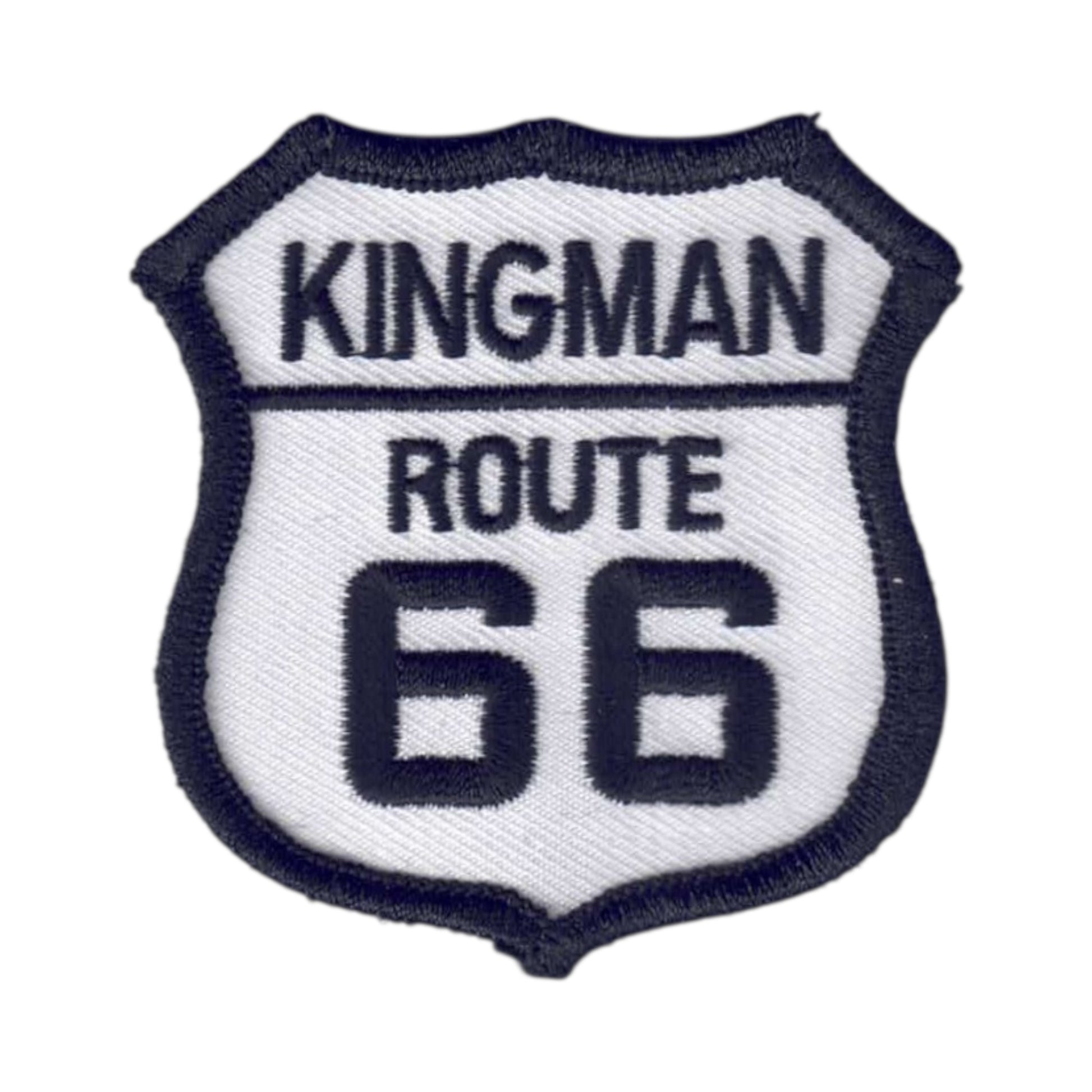 66KINGMAN-39 - KINGMAN ROUTE 66 Shield Black Text on White twill Souvenir Embroidered Iron On Patch.