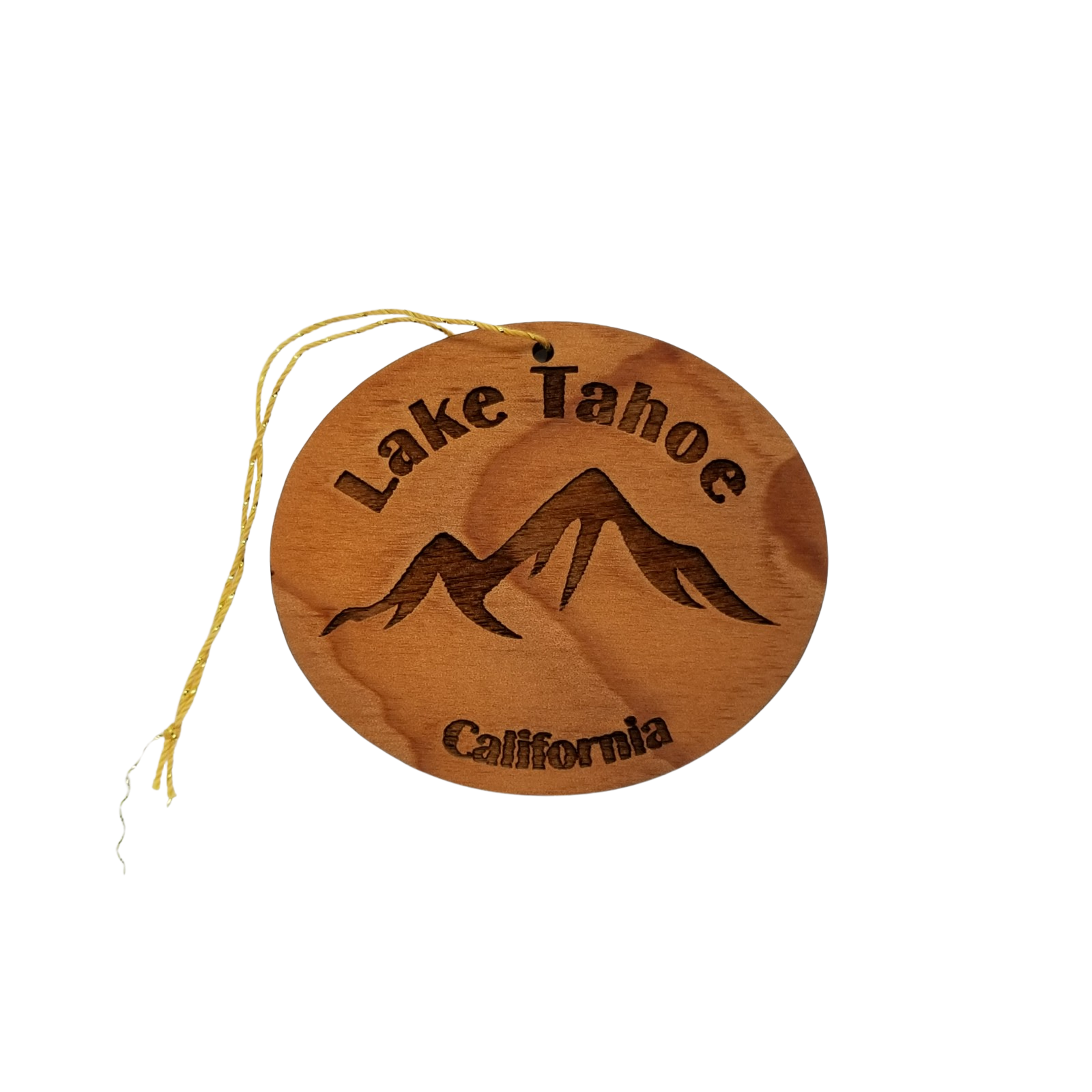 Lake Tahoe California Souvenir Ornament with Mountains and engraved with a Lake Tahoe California namedrop. These wood laser cut handmade ornaments are made in our little father and daughter woodshop in northern California and make a great CA souvenir or memento of Lake Tahoe and the surrounding Sierra Nevada Mountains.