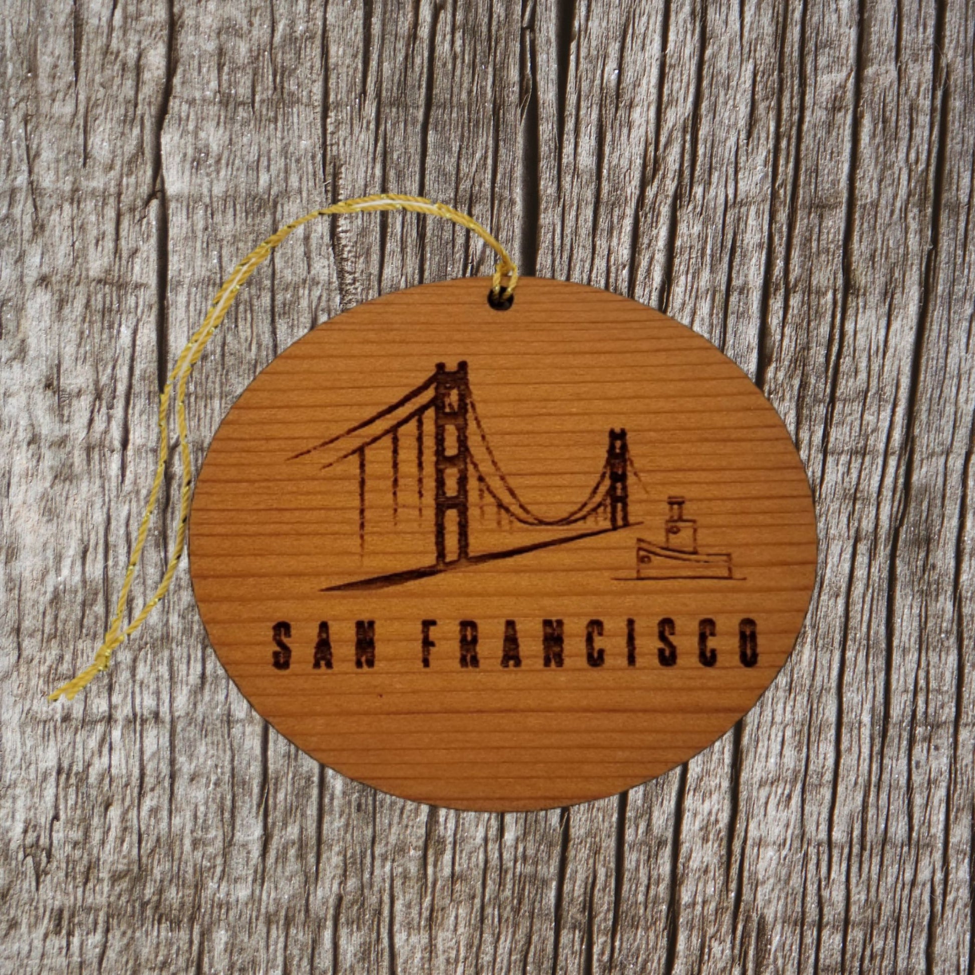 This wood Golden Gate Bridge with a tugboat in the fog in San Francisco California handmade ornament is made out of California Redwood and is approximately 3" x 2.5" x .25" thick. One of the main things you see and think about when you think about San Francisco, CA is the Golden Gate Bridge, fog, and tugboats making this Christmas ornament a great San Francisco Souvenir and Travel Gift.