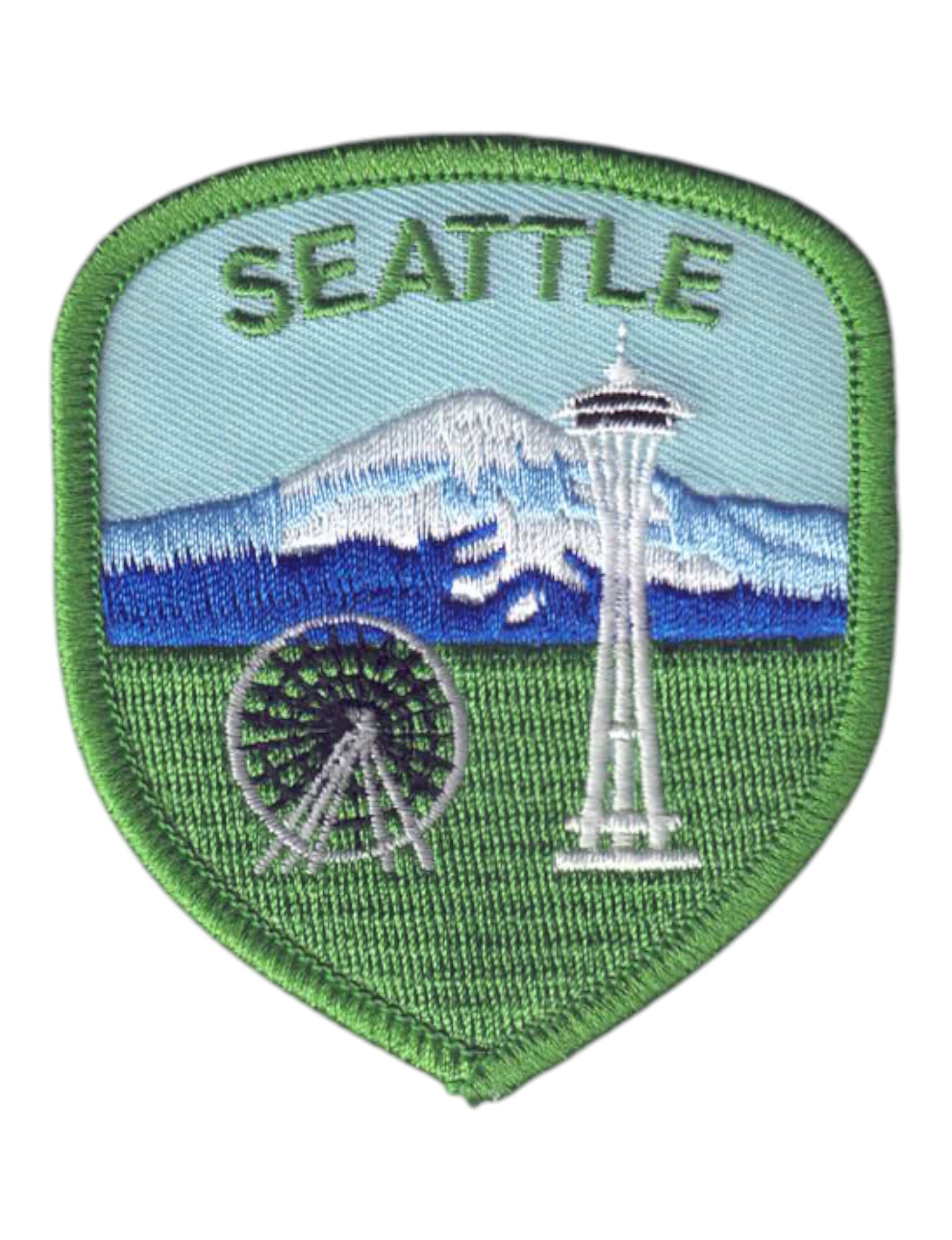 3398 - SEATTLE Space Needle, Ferris Wheel and Mt. Rainier Shield Souvenir Patch, Badge, or Emblem with Green Border