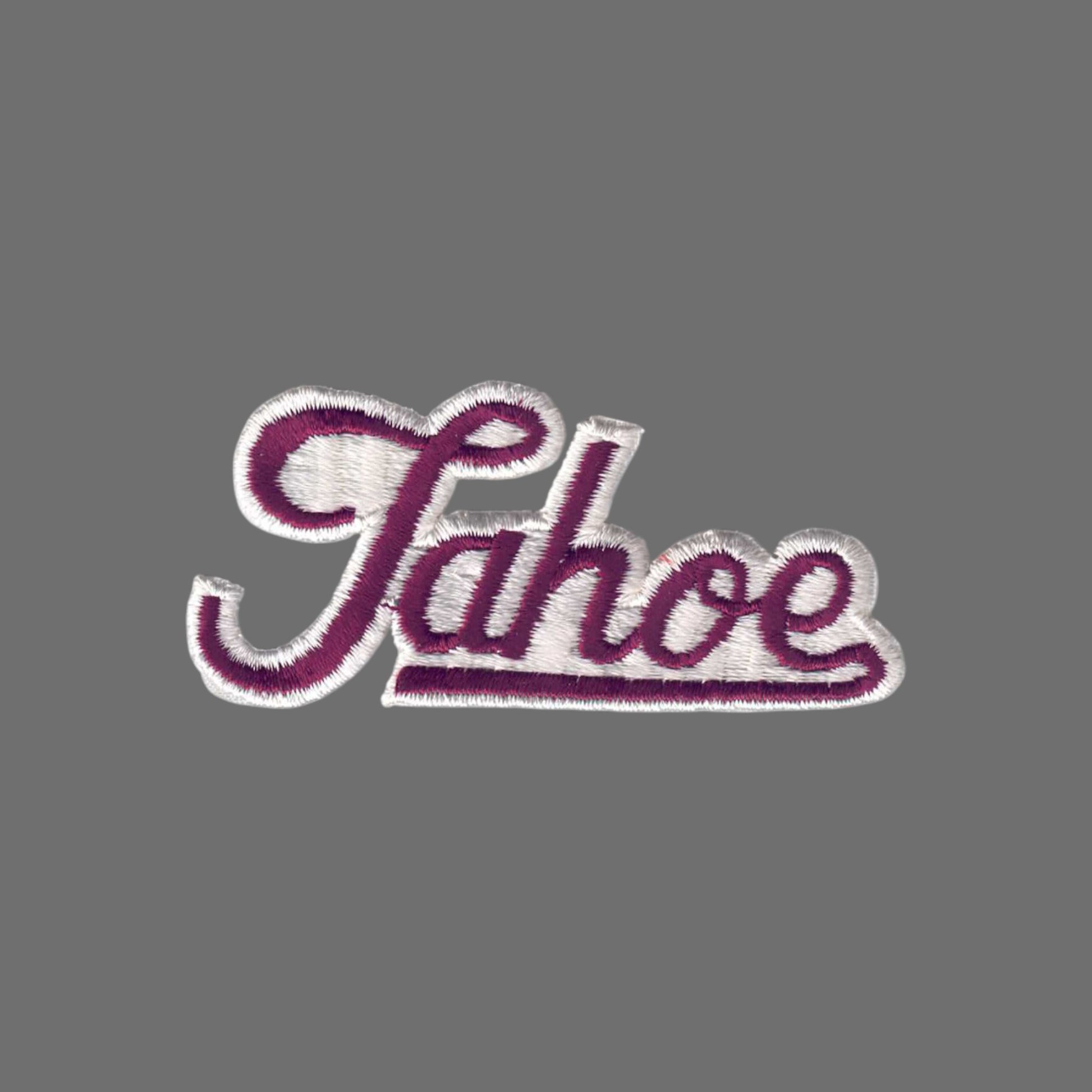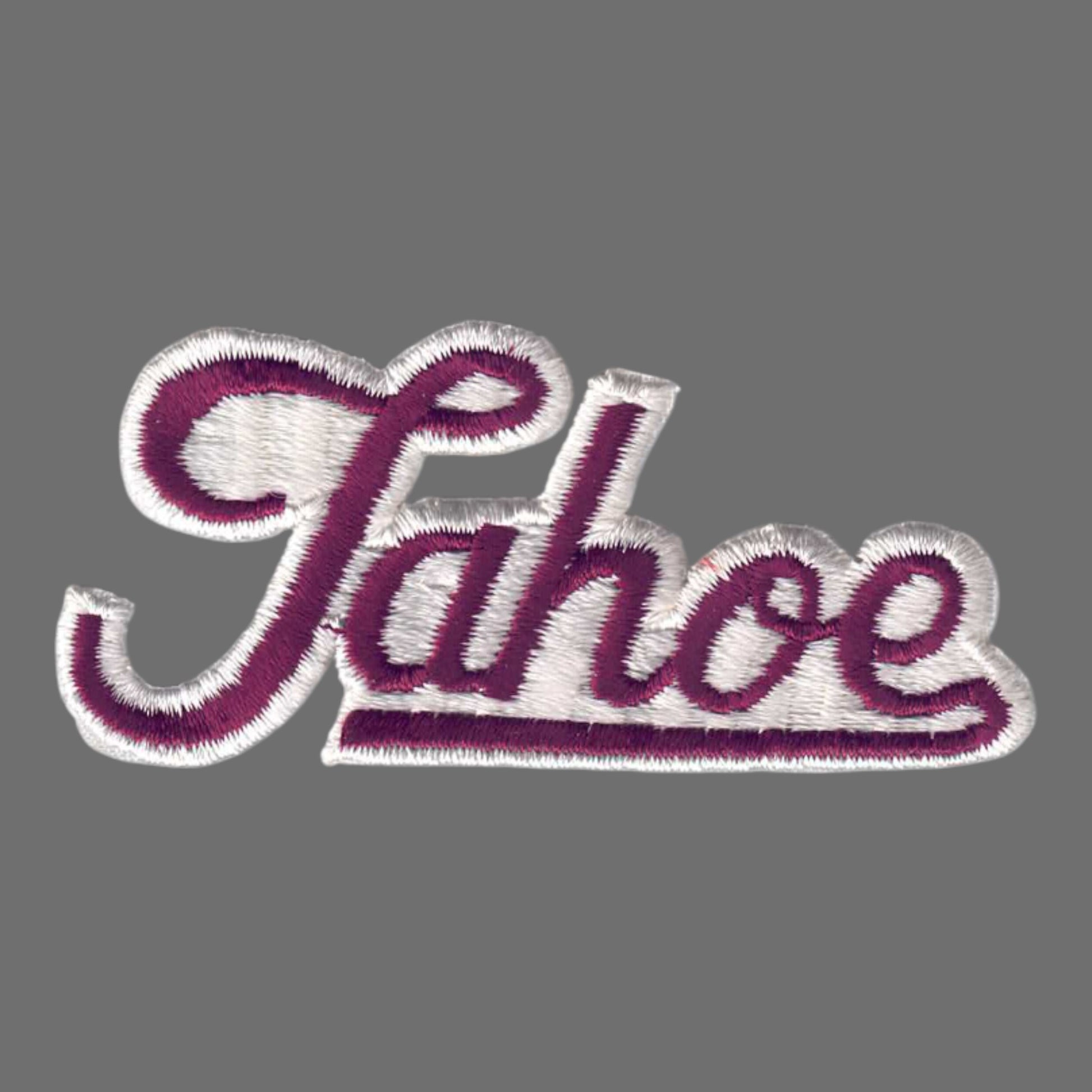 4203-29/39 - Vintage Tahoe script text or font Maroon Words on White Souvenir Patch, Badge, or Emblem.