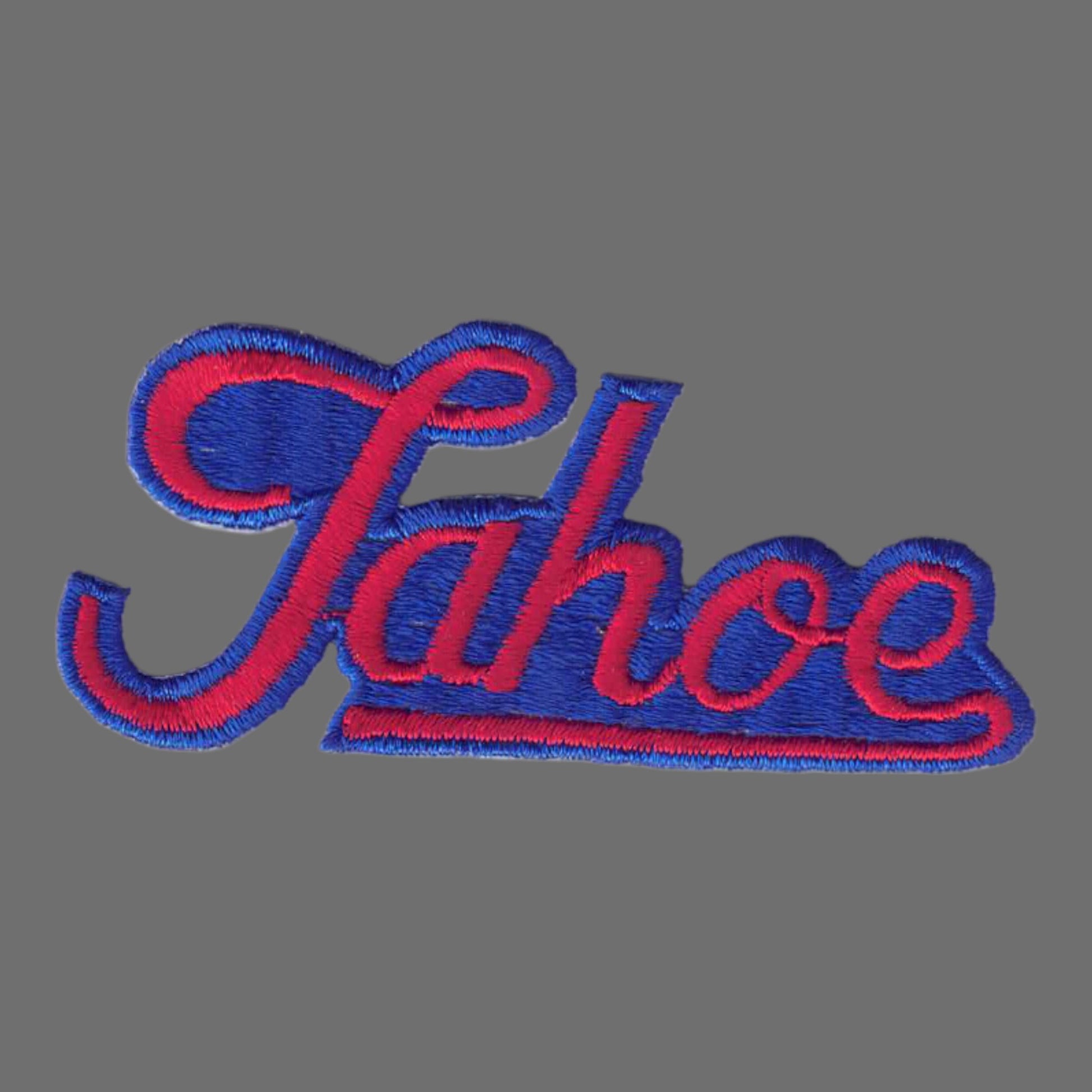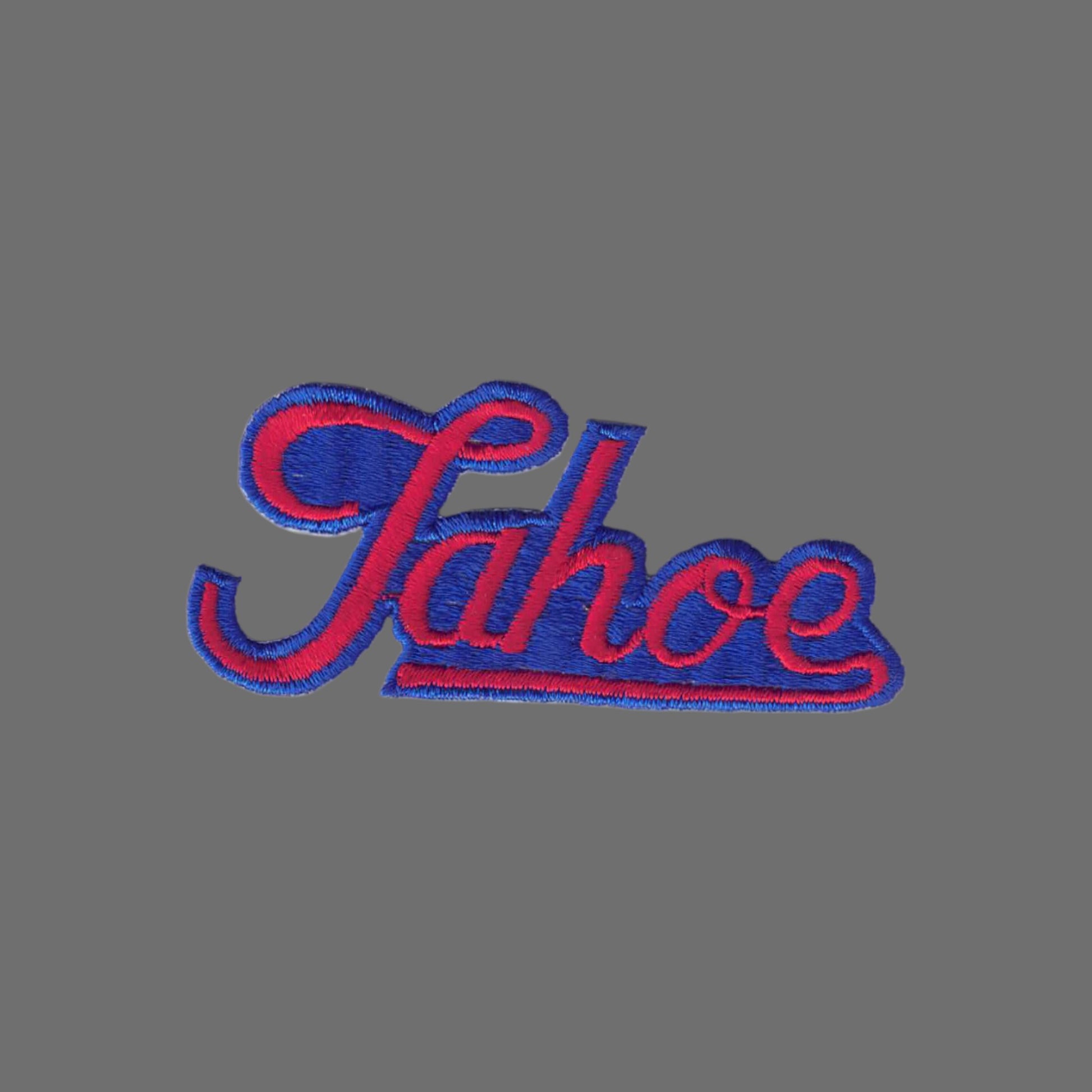 4203-36/11 - Vintage Tahoe script text or font Red Words on Royal Blue Souvenir Patch, Badge, or Emblem.
