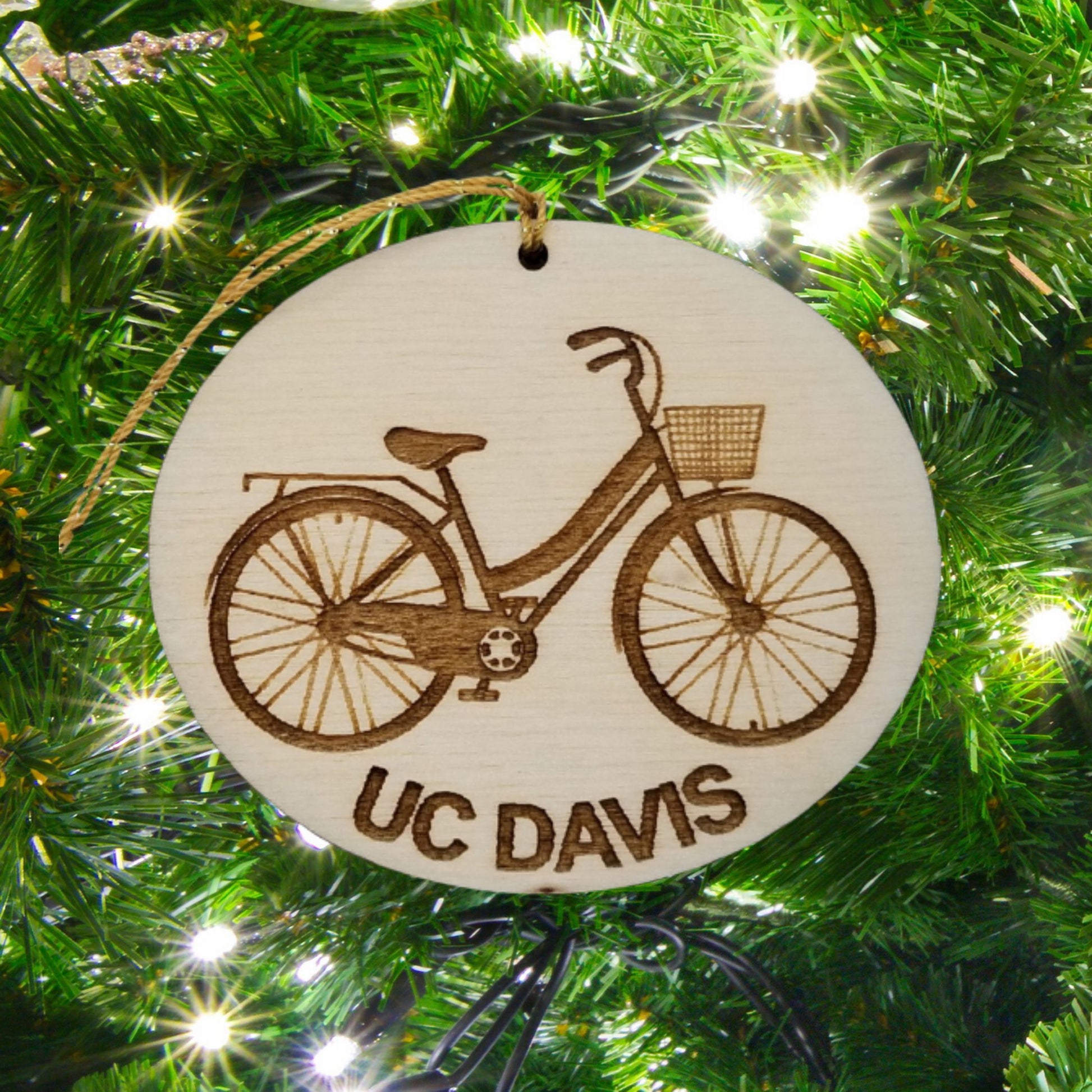 This UC Davis Ornament is handmade from wood in northern California. The engraved design depicts a women's bicycle with a front basket and back bike rack and says UC Davis at the bottom.
