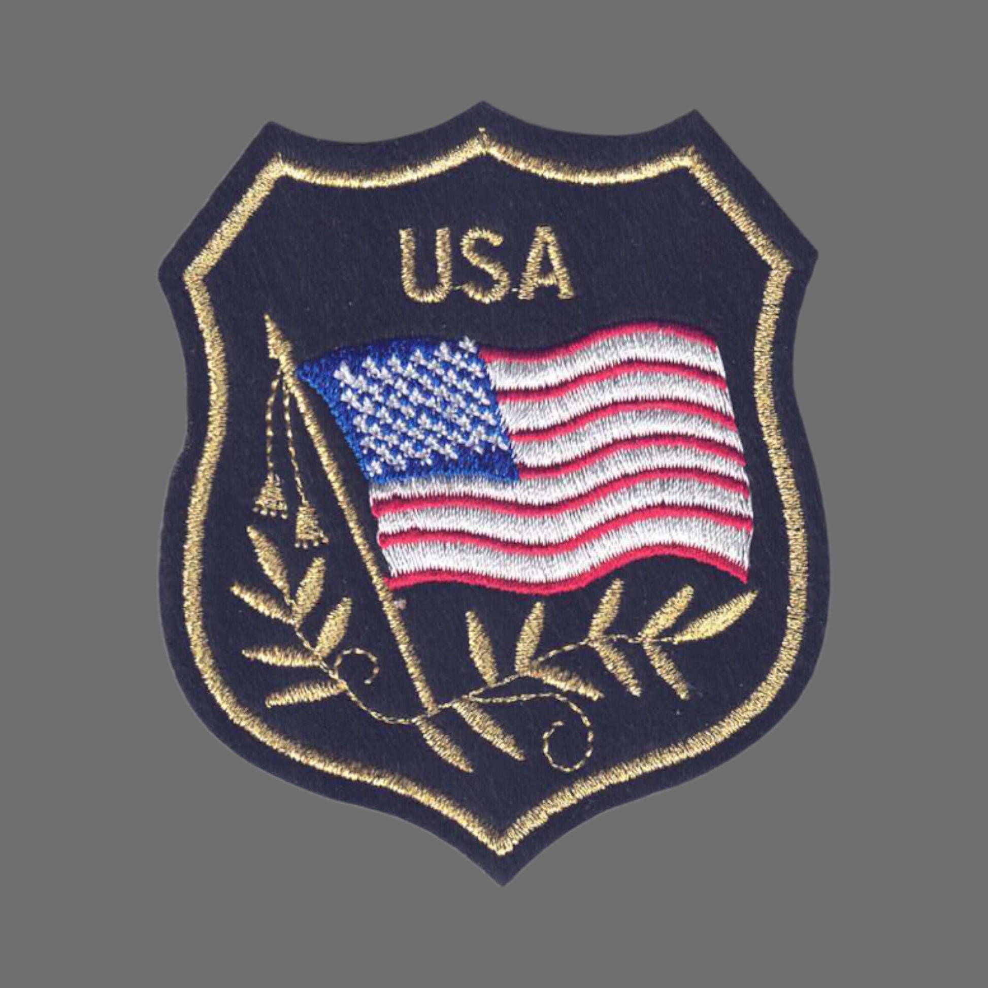 6822 - USA Country Flag Shield Embroidered Iron On Souvenir Black with Gold Mylar Thread Patch.